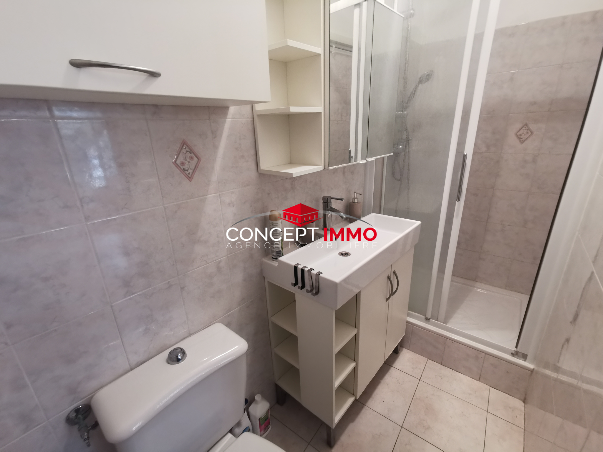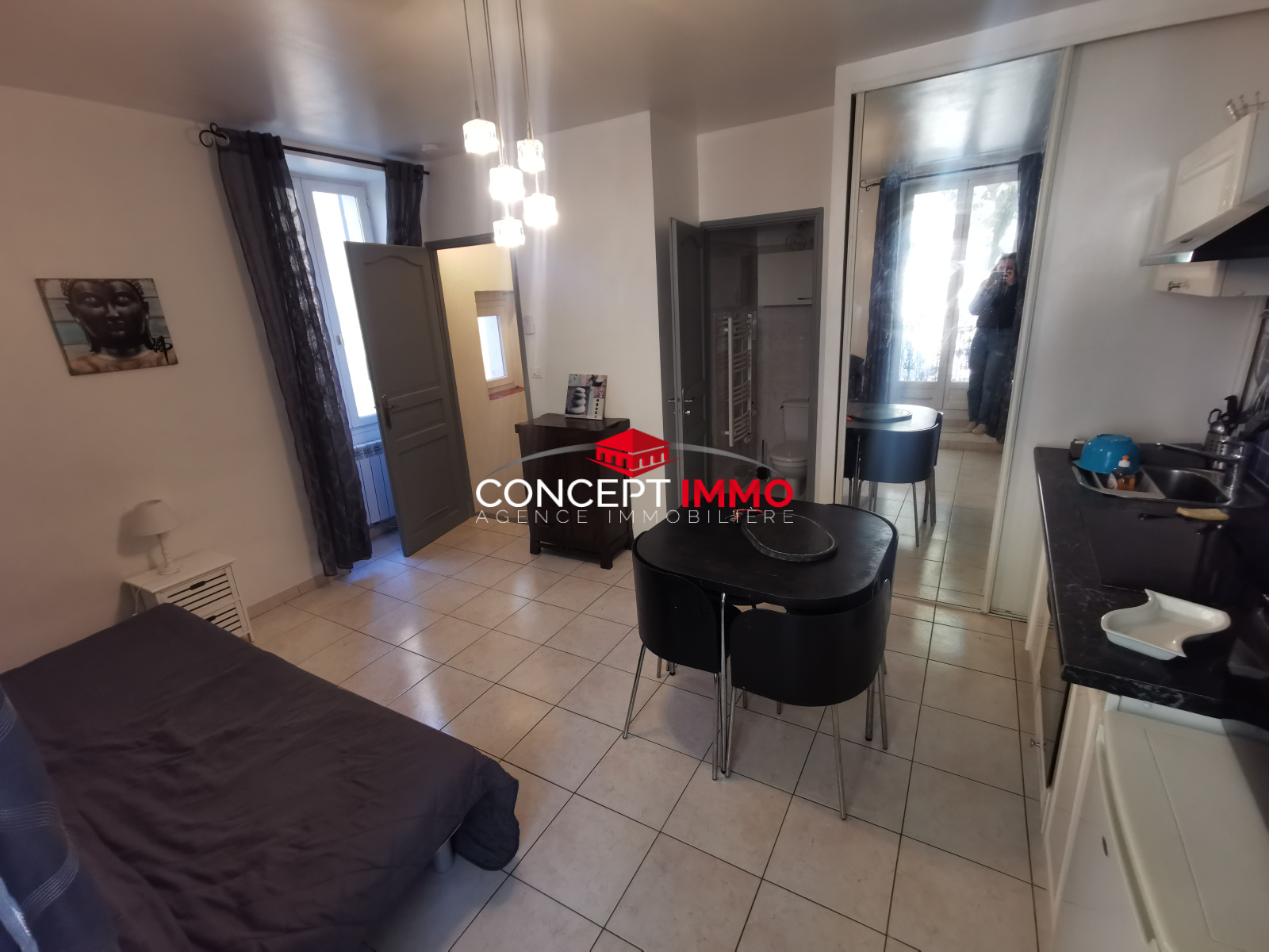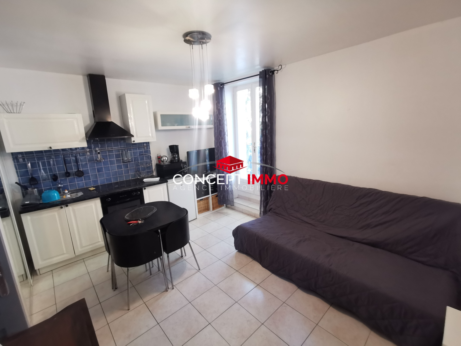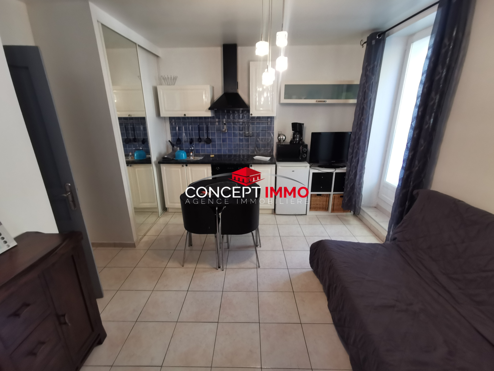 Le logement offre une agréable pièce de vie ouvrant sur un balcon, une cuisine aménagée, ainsi qu’une salle d’eau avec WC et sèche-serviettes.