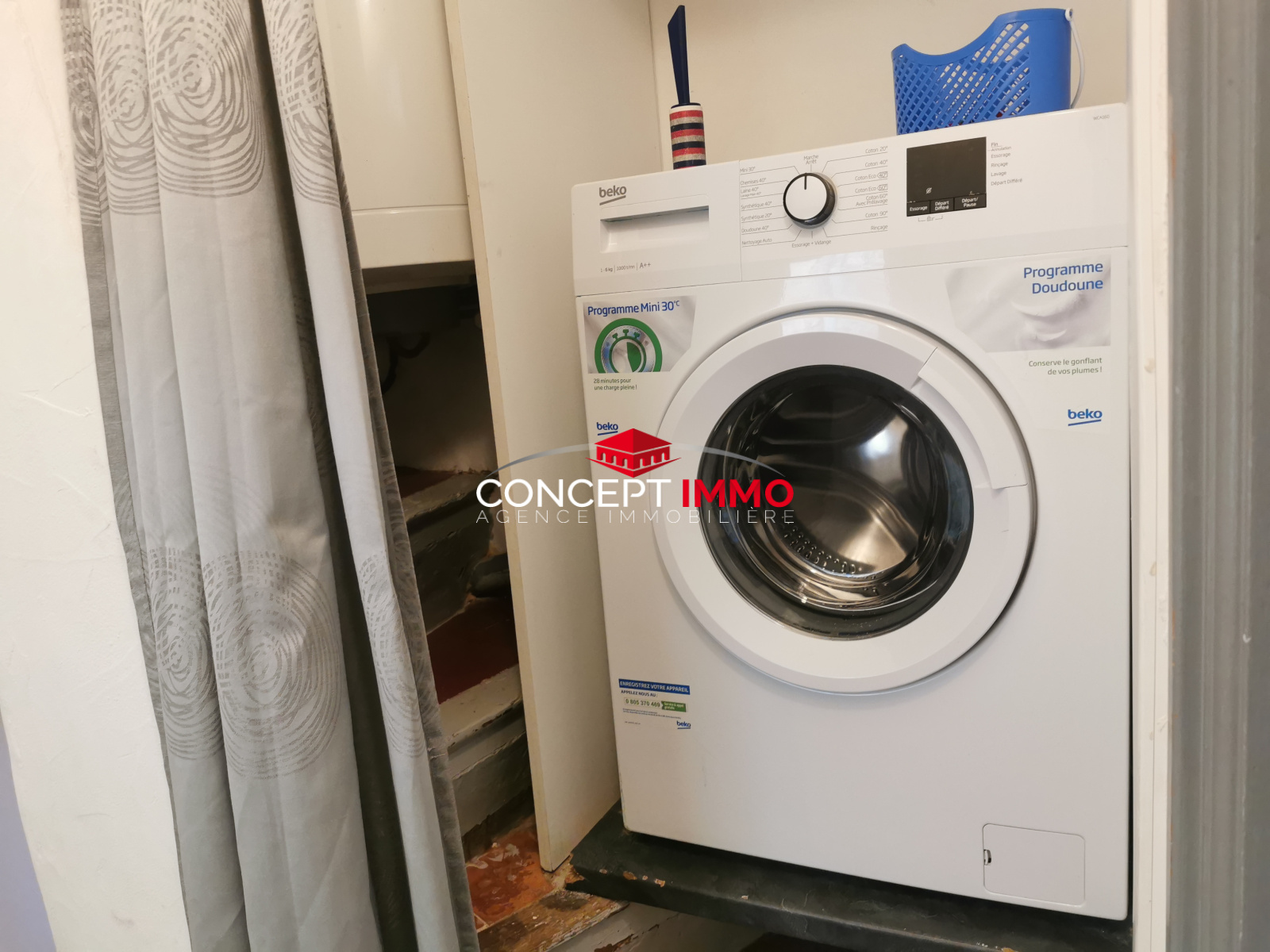 Il se compose d’une entrée privative au rez-de-chaussée avec cellier. À l’étage, un espace dédié à la machine à laver précède l’entrée de l’appartement.