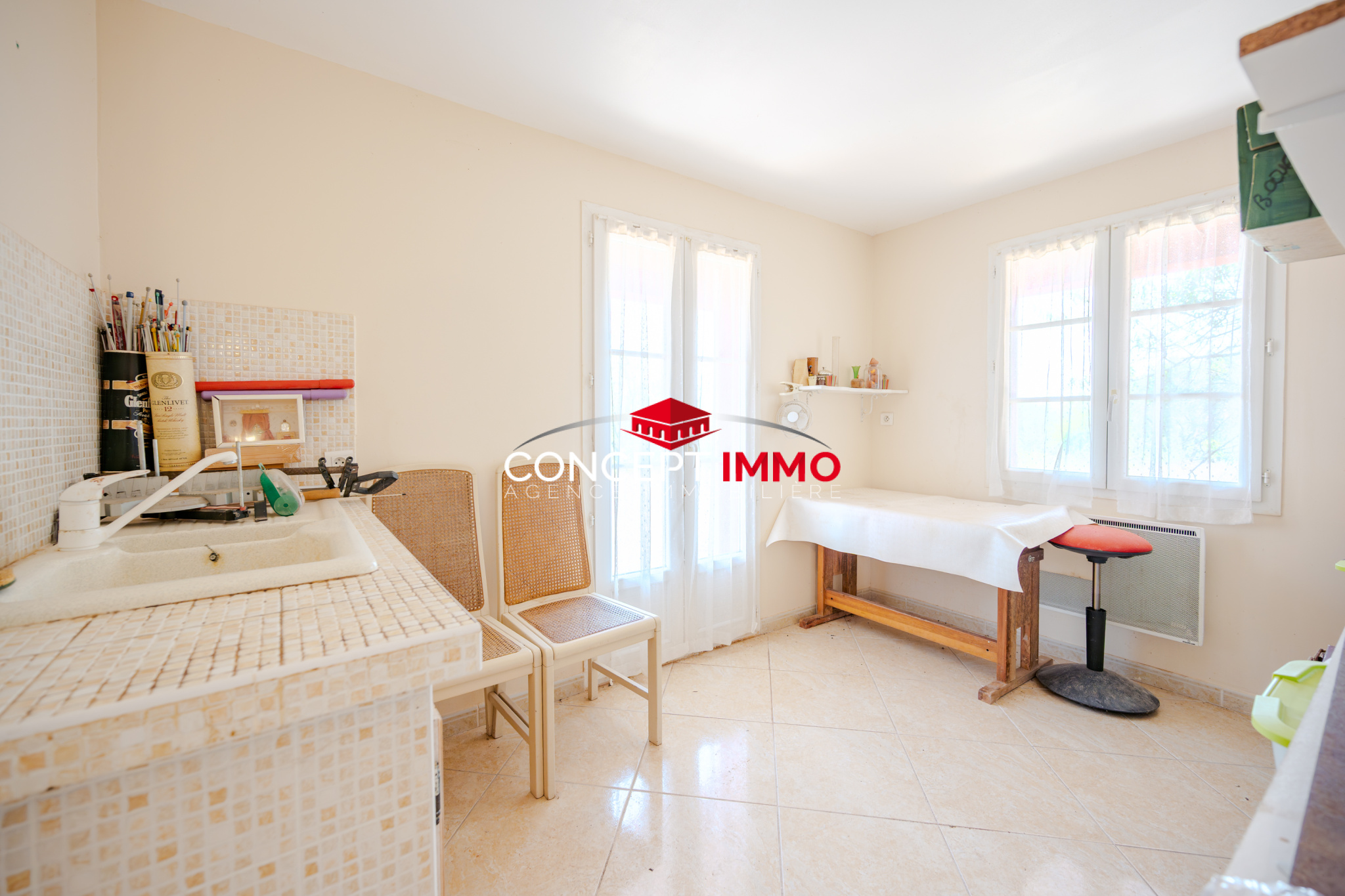 En rez de jardin, profitez d'une cuisine, wc, deux suites parentales, grande cave et local idéal pour devenir un local professionnel de type kinesitherapie ou autre avec parking indépendant.